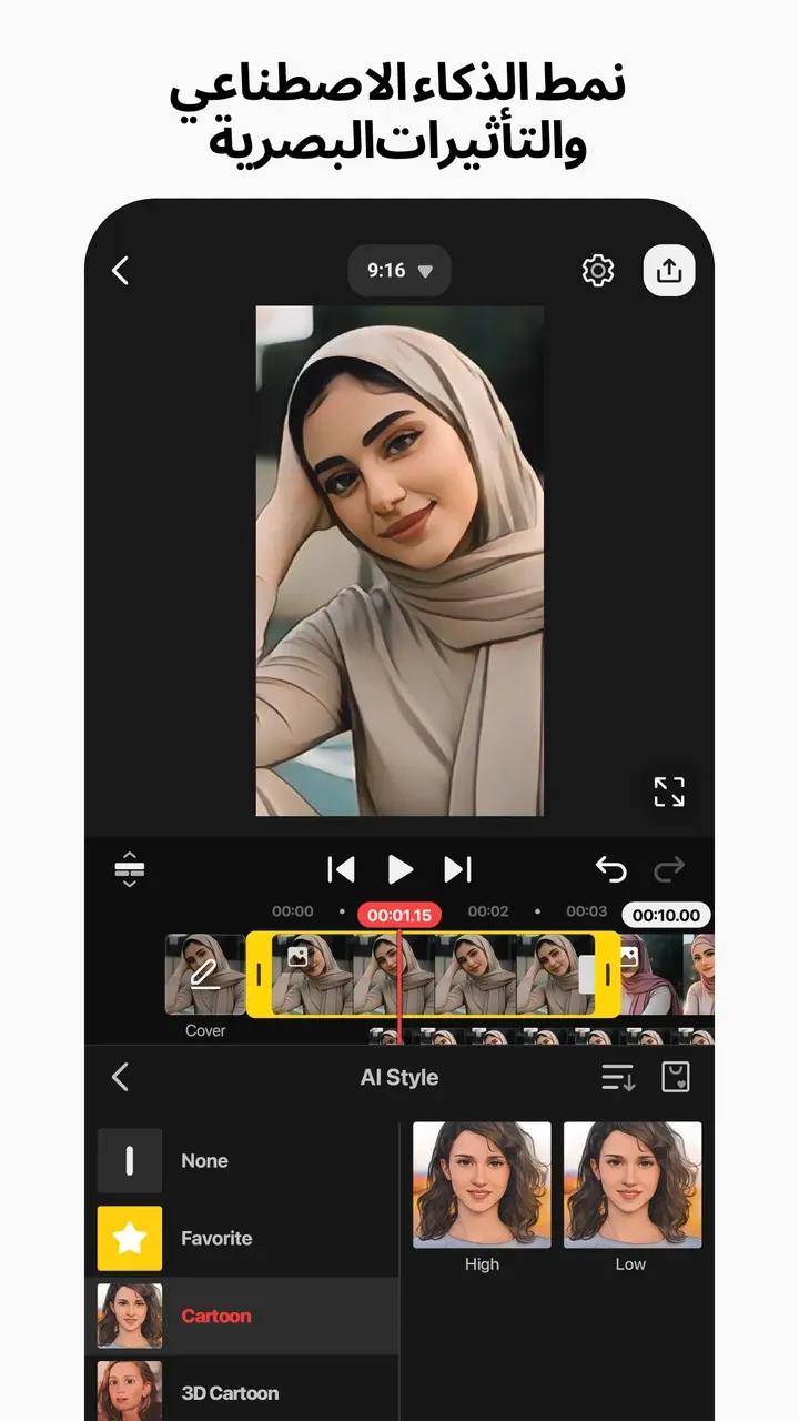 قم باستيراد الملفات، ترتيبها على الخط الزمني، إضافة الطبقات والتأثيرات ثم تصدير الفيديو النهائي. يوفر التطبيق إعدادات جاهزة للتعديل السريع مع أدوات متقدمة للتحكم الكامل.