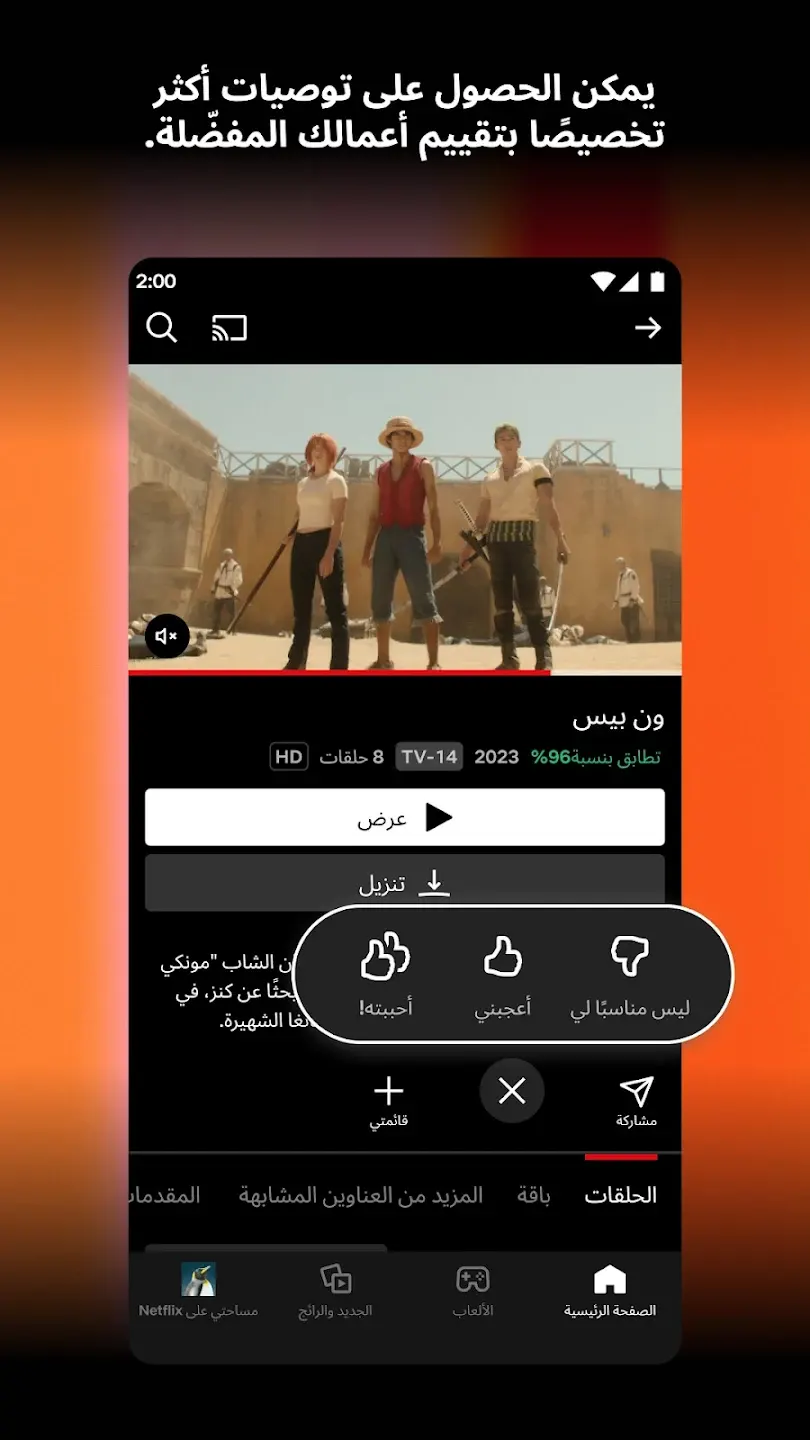 يتعلّم نتفليكس من اختياراتك ويقترح عناوين تناسب أسلوبك في المشاهدة. يمكنك تقييم العروض وإضافة المفضّلة إلى قائمة المشاهدة واستكشاف المحتوى الشائع حول العالم.