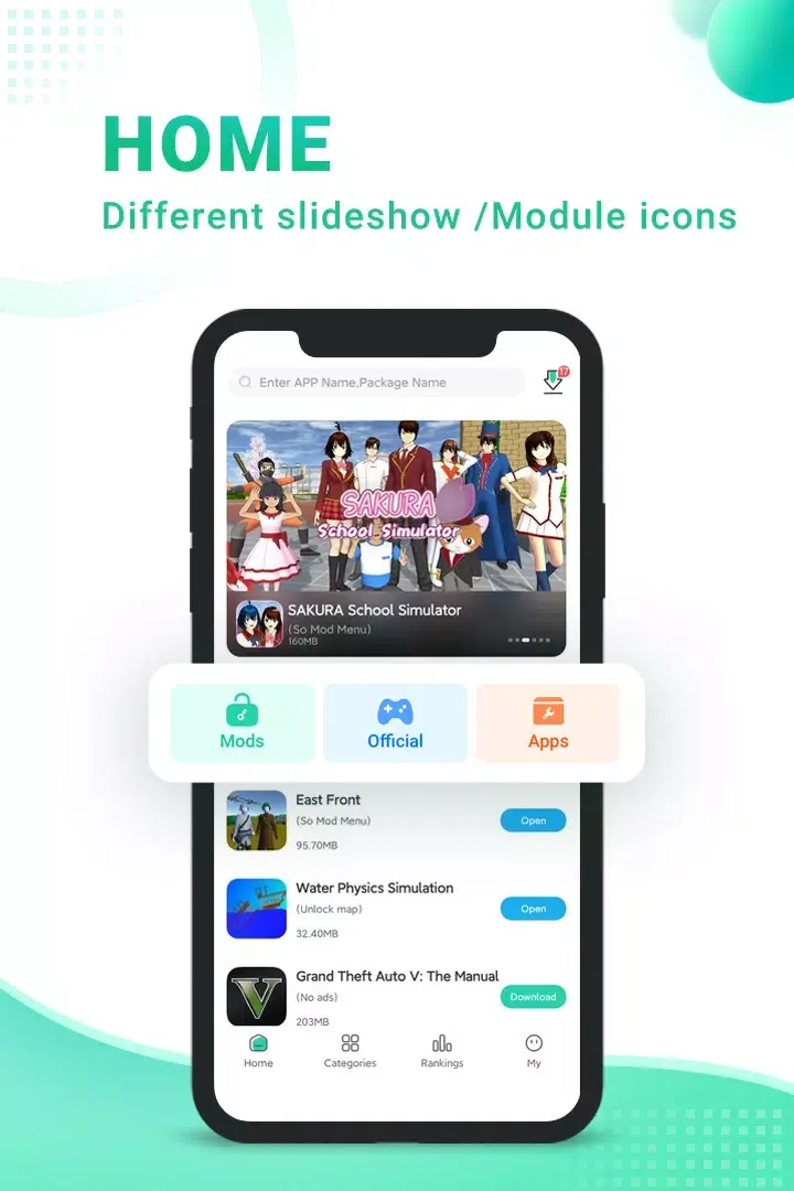 يوفّر التطبيق تصفحًا مرتبًا في فئات متعددة مثل الألعاب، أدوات التخصيص، التطبيقات الاجتماعية، وأكثر، مع إمكانية البحث المباشر للوصول إلى ما تحتاجه.