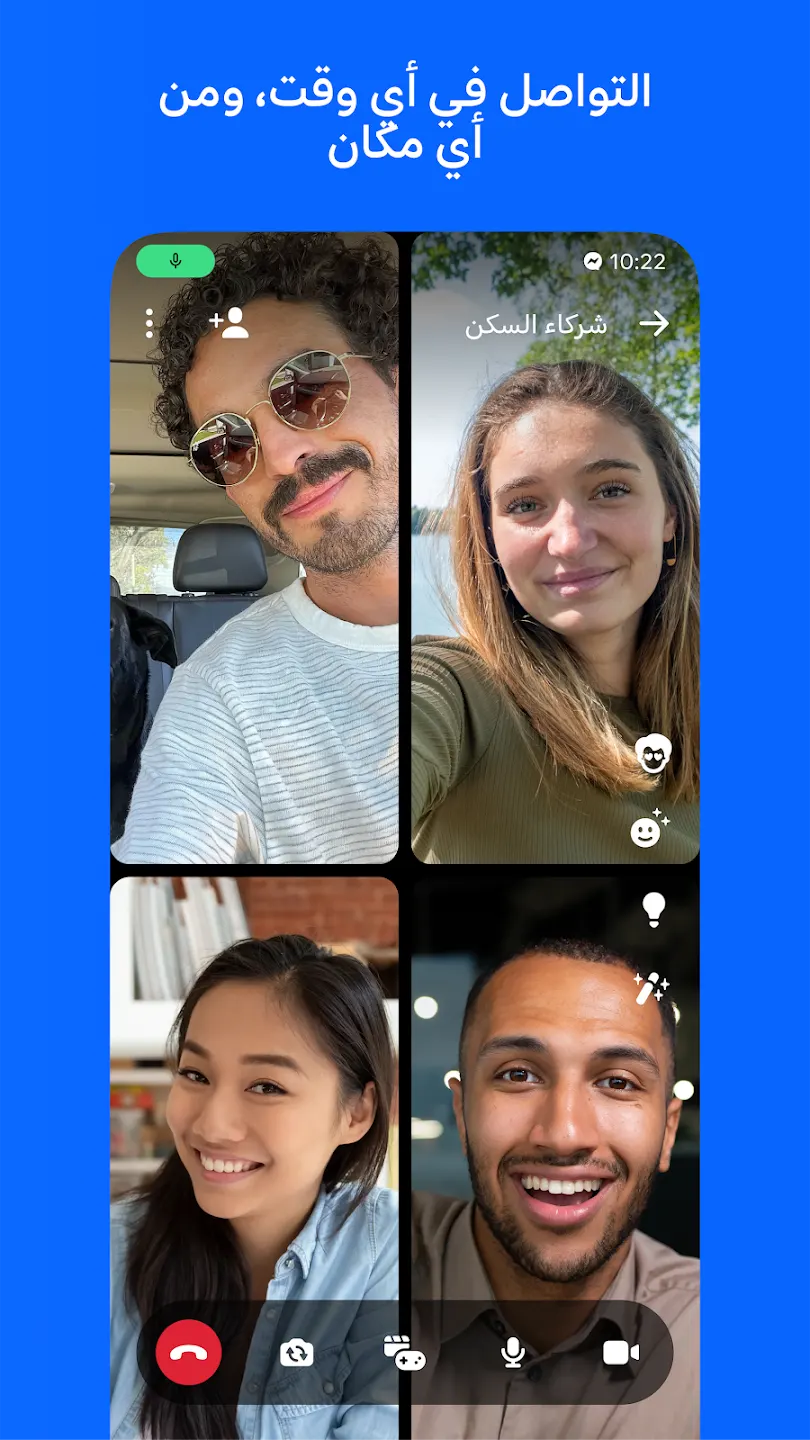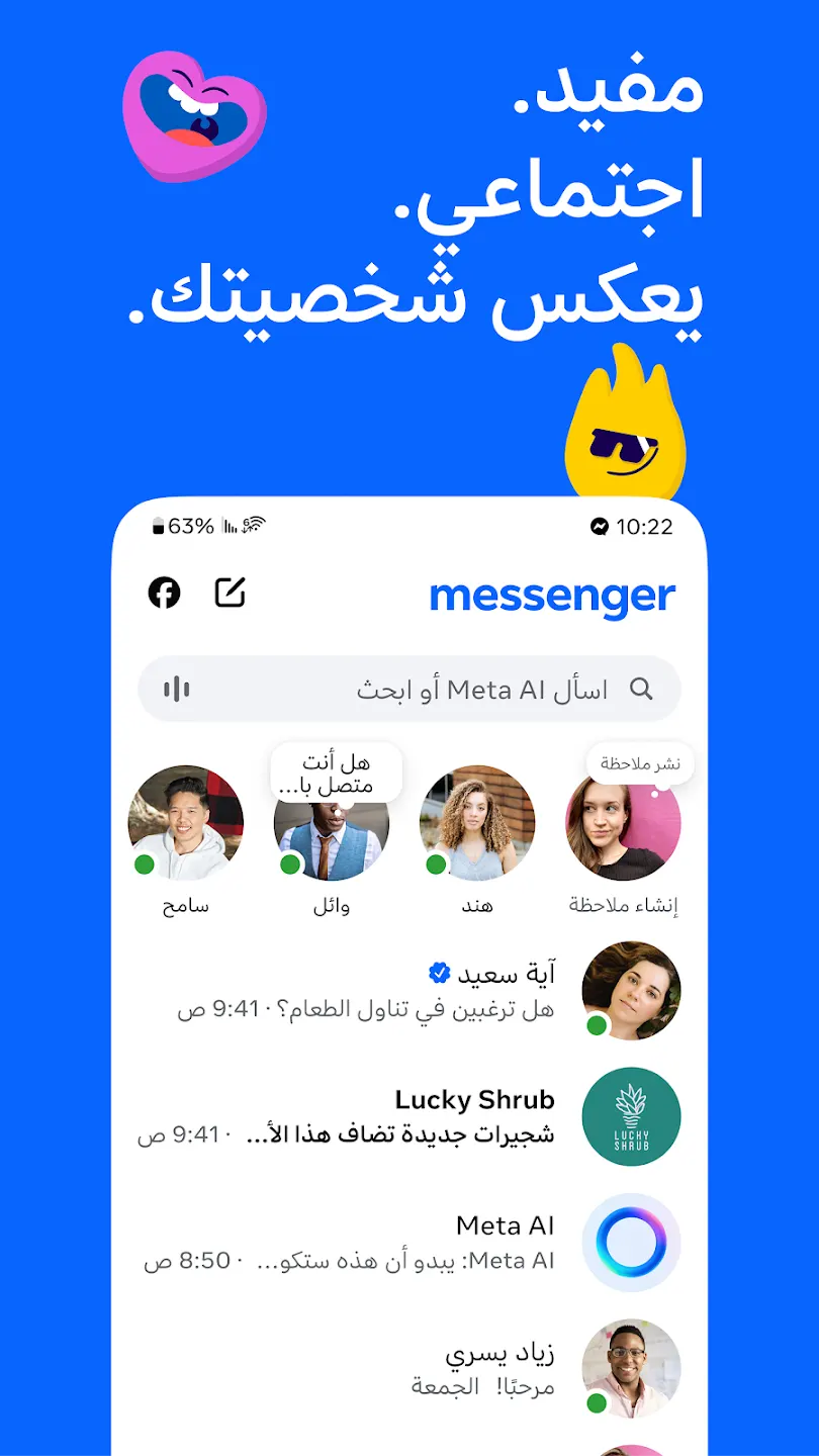 يدعم Messenger أيضًا إرسال الرسائل الصوتية، مشاركة الصور والفيديوهات بسرعة، وإضافة تأثيرات وملصقات أثناء المحادثة. كما يمكن استخدام التطبيق لمتابعة المحادثات من فيسبوك بسهولة.